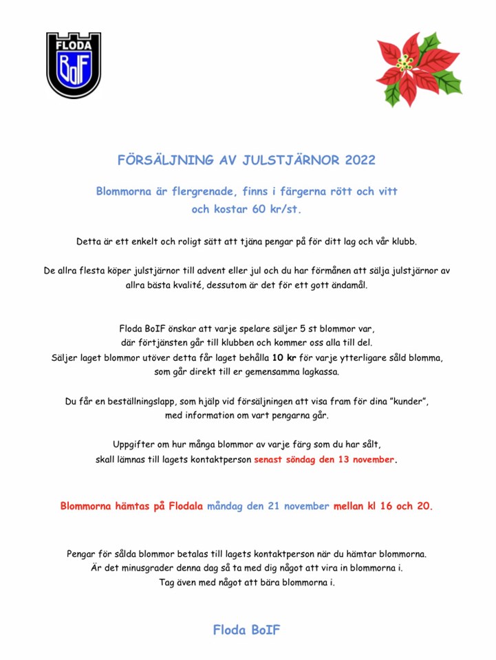 Julblommor 2022 Hej, Nu är det dags att ta upp beställningar på våra populära julstjärnor. Ni har alla varit med tidigare och kan rutinerna. Dom kostar 60kr st, klubben vill att ni säljer minst 5 st per/pers. Vi kan sälja fram till 13/11 då ni redovisar resultatet till Robert på sms (0706454665) Tex röd 10st Vita 10st Namn :............ Utlämning av blommorna sker måndagen den 21/11 (kl. 16-20). Ni betalar när ni hämtar blommorna. Lycka till! Gubbar.