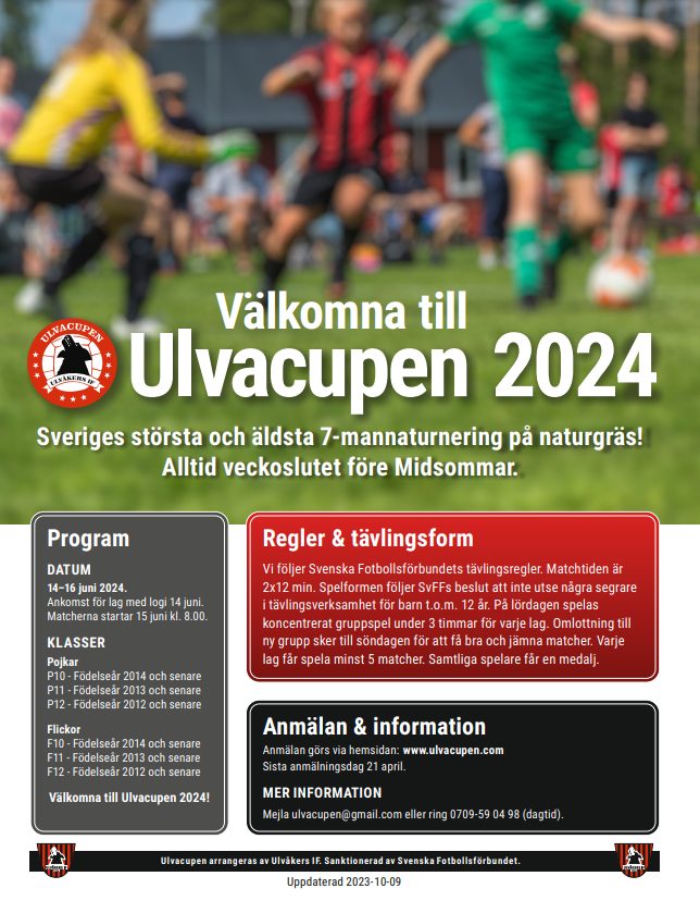 Hej, Vi har anmält ett lag till Ulvacupen 2024. Det kommer att bli vår allra första övernattningscup! (Wihow) Save the dates!