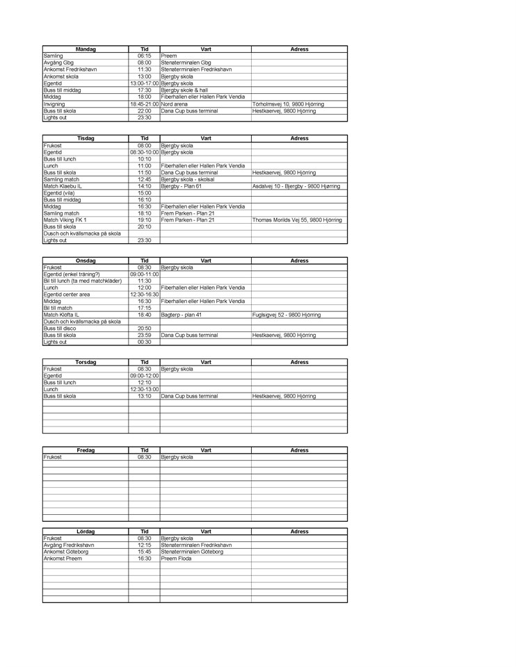 Hej alla föräldrar och killar! Nu börjar det verkligen närma sig för våran hittills största cup och resa som lag! Vi ser verkligen fram emot det och hoppas att ni gör likaså! Tidigare har Emma skickat ut en hel del praktisk information i nyhetsflödet. Länk nedan till det: Dana cup info Väldigt viktigt att alla killar har med sig GILTIGT pass. Stena lines regelverk kommer ej tillåta att någon utan giltigt pass åker över. Här kommer ytterligare information: - Samlingstid på Preem ändrad till 06:15 bara så att vi säkrar att vi inte är sena till avgången. - Lunch på skolan är ej inkluderat på Måndagen, så vi kommer att ha med oss pastasallad till killarna. - Skicka med ett par galgar för torkning/luftning. - Bifogat är ett preliminärt schema för både killarna samt de föräldrar som planerar att åka med så ni vet vart vi håller hus. Mån-Ons är ganska fast eftersom sista gruppspelsmatchen spelas på Onsdag kväll. Då vet vi hur vi hamnar inför slutspelet så Torsdagen och framåt får planeras efter det. - Mycket information (resultat, praktiskt, adresser m.m.) finns på dana cup websida. Dana websida Har ni några funderingar eller frågor är det bara att kontakta en av tränarna. MVH/Tränarna