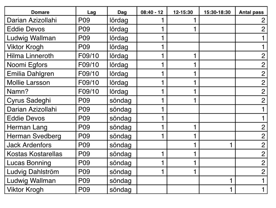 Här kommer tiderna för er som ska vara domare på helgens sammandrag. Kolla igenom och hör av er om tiden inte funkar till mig så snart som möjligt. Samling 20 minuter innan. Har ni visselpipa hemma, tag med.