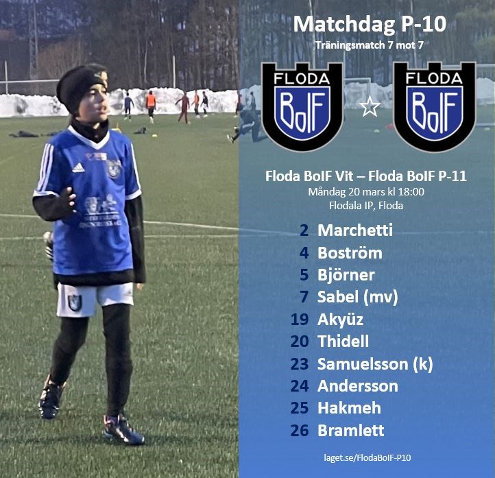 Floda BoIF Vit - Floda BoIF P-11 11-4 Träningsmatch Måndag 20 mars 2023 kl 18:00 Flodala IP, Floda Walter Andersson 4, Ture Samuelsson 2, Måns Björner 2, Oliver Aküyz, Neo Marchetti, Oskar Boström Matchen ser du på Hejafloda.se