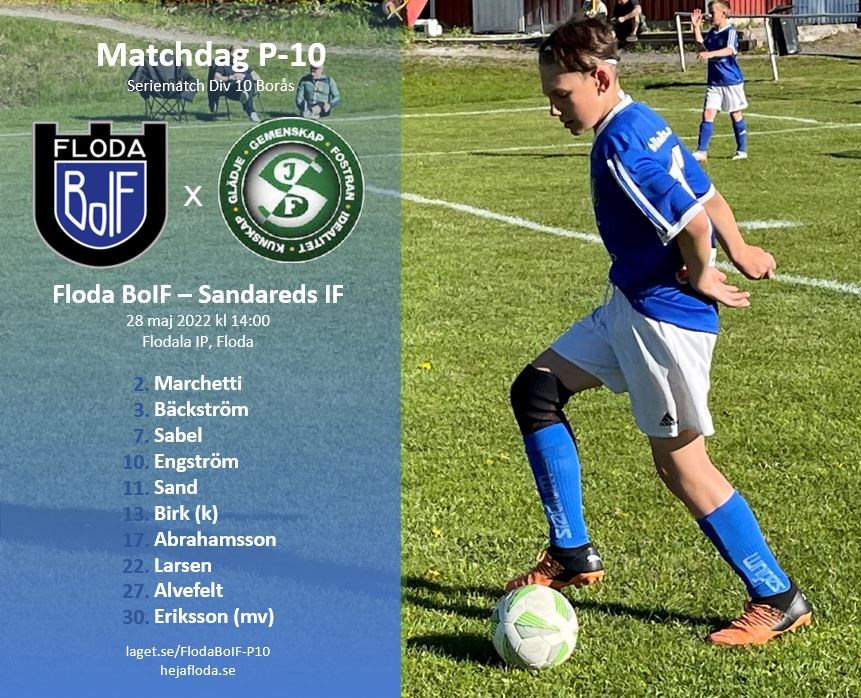 Floda BoIF - Sandareds IF Div 10 Borås Lödag 28 maj kl 14:00 Flodala IP Köp lotter i vårt lotteri på plats! Fina priser och intäkten går direkt till lagkassan.